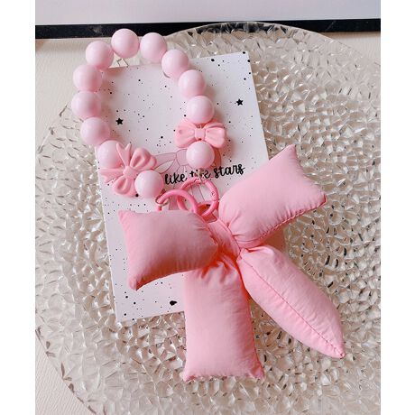 ころんとしたウッド調ビーズと、軽やかな布リボンがセットになったデザインキーホルダー。