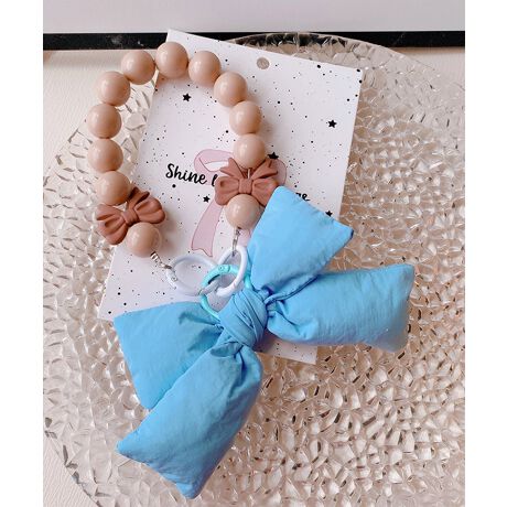 ころんとしたウッド調ビーズと、軽やかな布リボンがセットになったデザインキーホルダー。