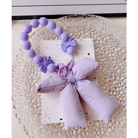 ころんとしたウッド調ビーズと、軽やかな布リボンがセットになったデザインキーホルダー。