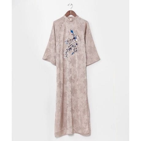 [型番:COT-6114-2026]牡丹の刺しゅうと大胆なスリットが印象的なアオザイ風ワンピース。サテンジャカードの艶やかさが女性らしさを引き立てる一枚。