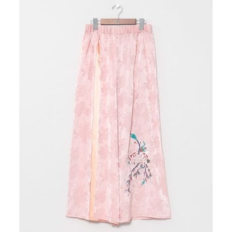 [型番:COT-6110-2026]牡丹の刺しゅうとスリットから見える配色生地が美しいフレアパンツ。アオザイに着想を得たデザインで、レイヤード風の華やかな仕上がり。