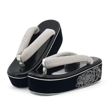 艶消し(ホワイト)と艶あり(ブラック)のエナメル加工の天に、巻はスエード調の素材に牡丹の刺繍が施され、縮緬の鼻緒が挿げられています。