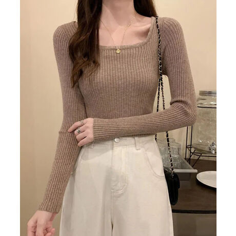 デコルテをきれいに魅せる、女性らしさ引き立つUネックリブニットトップス。