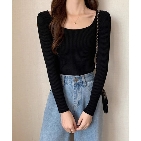 Uネックリブニットトップス