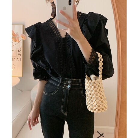 繊細なレース使いと立体感のあるフリルが目を引くブラウス。