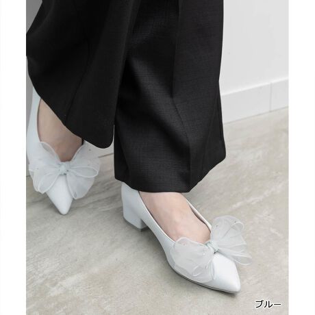 繊細なビジューをあしらったシアーリボンが目を惹くチャンキーヒールパンプス。