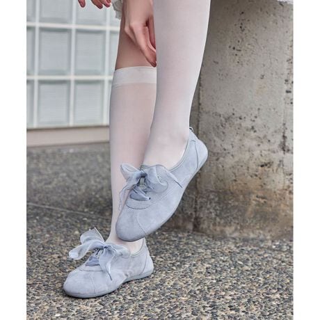 スニーカーとバレエシューズがドッキングしたようなリボンフラットスニーカー。