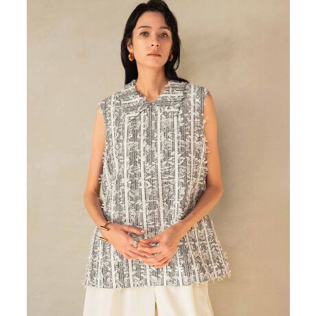 【2026SS】襟付き ツイード ノースリーブブラウス オフィス リボン