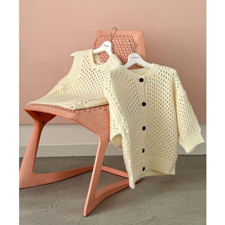 マルチウェイで活躍すること間違いなしのメッシュ編みノースリトップスとカーディガンのアンサンブルです。