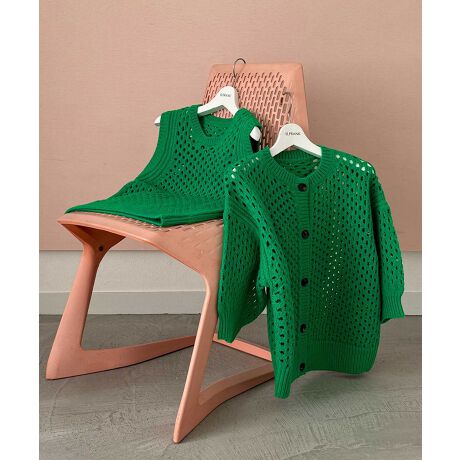 マルチウェイで活躍すること間違いなしのメッシュ編みノースリトップスとカーディガンのアンサンブルです。