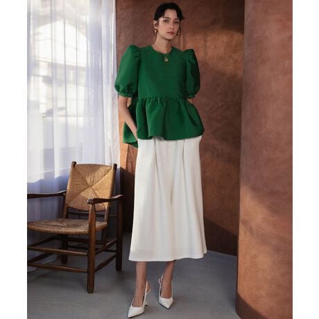 微光沢のハリ感のある素材を使ったペプラムチュニック。