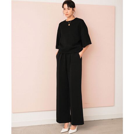 ウエストにテンションのあるゴムを使用し、ピンタックのディティールを採用したストレートワイドパンツ。