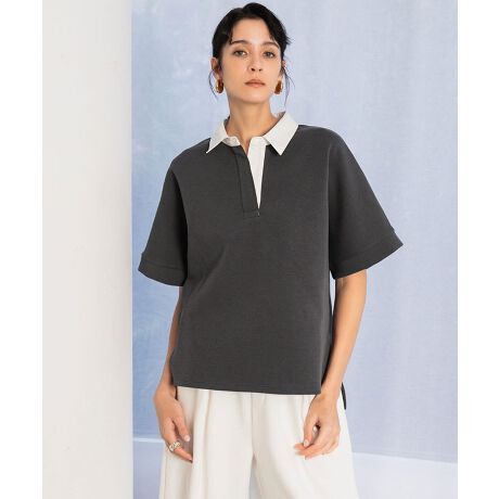 カジュアルになりがちなポロデザインをドルマンシルエットと光沢感のあるダンボール素材使いでモードにアップデート。