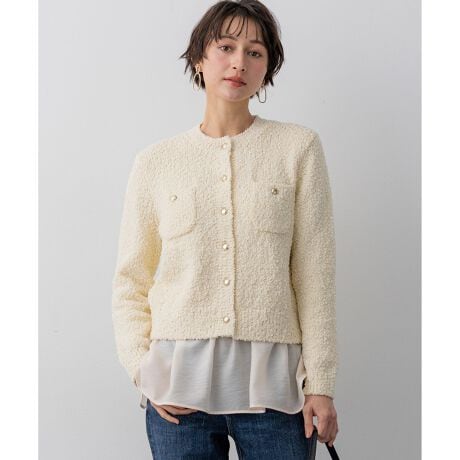 程よくしっかりとした編み地で、ツイードのような表情が魅力のニットカーディガンです。イタリア糸ならではの豊かな風合いと、ふっくらとした立体感が特徴で、羽織るだけで着こなしに存在感をプラスします。ゴールドのボタンと胸元のポケットがアクセントになり、上品で高級感のあるデザインに仕上げました。コンパクトな丈感は、ワンピースやスカートとの相性も抜群。オフィススタイルにはもちろん、デニムやワイドパンツと合わせてカジュアルダウンしたり、きれいめなボトムスと合わせればお食事会などのお出かけにも活躍する、着回し力抜群のアイテムです。カラーは、優しく上品な印象を与えるアイボリー(#002)と、空のように爽やかで華やかなスカイブルー(#072)の2色展開です。