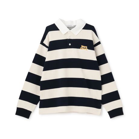 ゆったりとしたシルエットでルーズに着こなせるラガーシャツです。胸元のロゴ刺しゅうがおしゃれなポイントになっています。コットン100%の裏毛仕様で肌触りが良く、着心地も快適。パンツにもスカートにも合わせやすい、デイリーに着回しが利くアイテムです。刺しゅうの裏に「あて布」はございません。