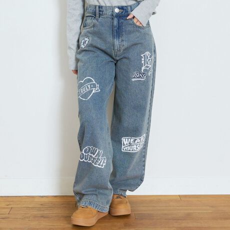 ポジティブなフレーズとハートなどのワクワクするモチーフがポイント! 掠れプリントやワッペンを加えたストリートデザインです。