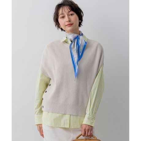 表情豊かな畦編みが魅力のニットベストです。クルーネックデザインは、シャツやカットソーとのレイヤードスタイルに最適で、いつものコーディネートに新鮮な表情をプラスします。両脇にあしらわれたボタンは、開閉することでスリットのようにアレンジでき、着こなしに変化と抜け感を演出。様々なインナーとの組み合わせで、幅広いスタイリングをお楽しみいただけます。 カラーは、上品で落ち着いた印象を与える万能カラーのベージュ(#033)、爽やかで洗練された、顔色を明るく見せるスカイブルー(#072)、知的でシックな、着回し力抜群の定番カラーのネイビー(#075)、柔らかな日差しのような、コーディネートに華を添えるライトイエロー(#042)の4色展開です。