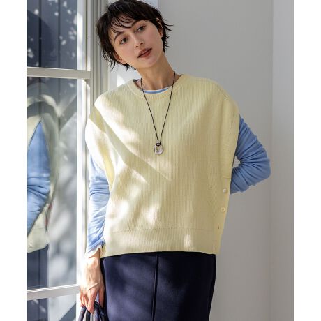 表情豊かな畦編みが魅力のニットベストです。クルーネックデザインは、シャツやカットソーとのレイヤードスタイルに最適で、いつものコーディネートに新鮮な表情をプラスします。両脇にあしらわれたボタンは、開閉することでスリットのようにアレンジでき、着こなしに変化と抜け感を演出。様々なインナーとの組み合わせで、幅広いスタイリングをお楽しみいただけます。 カラーは、上品で落ち着いた印象を与える万能カラーのベージュ(#033)、爽やかで洗練された、顔色を明るく見せるスカイブルー(#072)、知的でシックな、着回し力抜群の定番カラーのネイビー(#075)、柔らかな日差しのような、コーディネートに華を添えるライトイエロー(#042)の4色展開です。