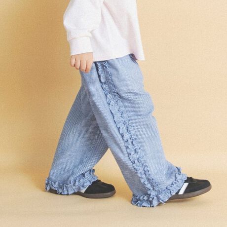 サイドと裾にふんだんに使ったフリルが可愛いロングパンツは爽やかなブルーギンガム柄と小花柄の2色展開です