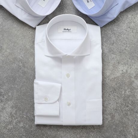 ・第一ボタンを外しても襟の形が崩れにくいワイドカラー
