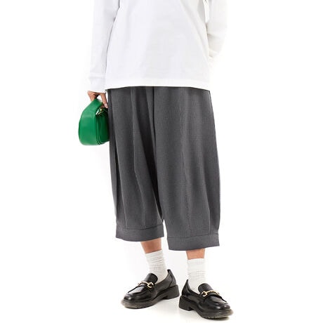 【素材】リサイクル素材を使用したエコな素材はウールのような温かみを持つソフトな風合いが◎。無地見えもする細かで繊細な千鳥格子柄でイージーケアな点もポイントです。【デザイン】膝付近に角を出したような独特のシルエットがポイントのスラックス。素材の持つクラシックな雰囲気に遊びの効いたシルエットとボリューム感で他には無い存在感を出しています。ウエストがゴムとヒモでイージーな仕立てになっている点もきめ過ぎずさり気ないポイントです。【ブランド情報】FRAPBOIS/フラボア2001年にブランドスタート。「大人げない大人の服」をコンセプトに、大人が着るリラックスしたデイリーウェアを提案するコレクションブランド。レディースとメンズのアイテムをご用意しています。