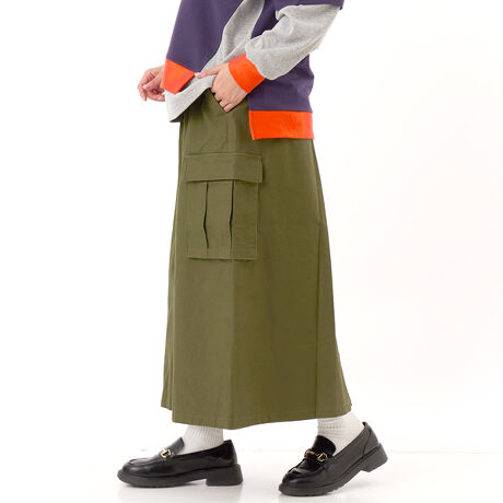 【素材】サテン織の生地の裏面を使った「バックサテン」生地はマットで程よい光沢感とキレイな表面感が特徴。【デザイン】程よい広がりのAラインスカートは脇のカーゴモチーフがポイント。素材のバックサテンとも相性の良いデザインでミリタリーテイストがうまく溶け込んだデザインになっています。ウエストがゴムとヒモでイージーな仕立ても嬉しいポイントです。【ブランド情報】FRAPBOIS/フラボア2001年にブランドスタート。「大人げない大人の服」をコンセプトに、大人が着るリラックスしたデイリーウェアを提案するコレクションブランド。レディースとメンズのアイテムをご用意しています。