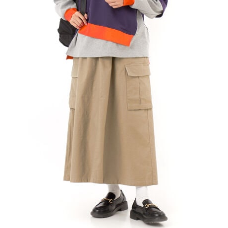 【素材】サテン織の生地の裏面を使った「バックサテン」生地はマットで程よい光沢感とキレイな表面感が特徴。【デザイン】程よい広がりのAラインスカートは脇のカーゴモチーフがポイント。素材のバックサテンとも相性の良いデザインでミリタリーテイストがうまく溶け込んだデザインになっています。ウエストがゴムとヒモでイージーな仕立ても嬉しいポイントです。【ブランド情報】FRAPBOIS/フラボア2001年にブランドスタート。「大人げない大人の服」をコンセプトに、大人が着るリラックスしたデイリーウェアを提案するコレクションブランド。レディースとメンズのアイテムをご用意しています。