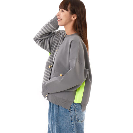 【素材】サラッとした肌触りと程よい光沢感が特徴の糸を使い、ややしっかりとしたミラノリブ編みで仕上げました。【デザイン】左右で異なった柄のミラノリブを大胆に組み合わせたマリンテイストの羽織り。フロントの金属ボタンが上品で大人っぽい雰囲気を出しています。ドロップショルダーにやや短めの着丈でボレロ調にも着用できるアイテムです。【ブランド情報】FRAPBOIS/フラボア2001年にブランドスタート。「大人げない大人の服」をコンセプトに、大人が着るリラックスしたデイリーウェアを提案するコレクションブランド。レディースとメンズのアイテムをご用意しています。