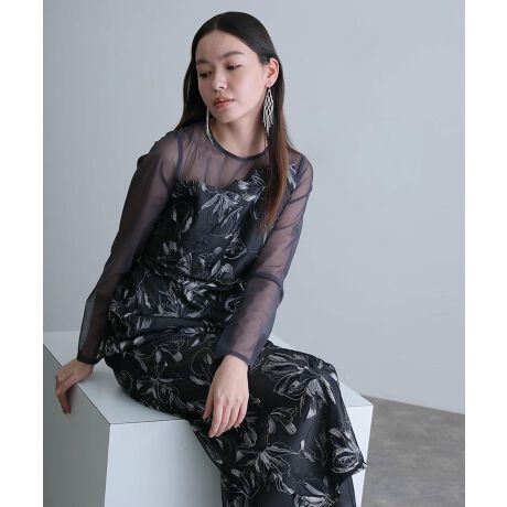 デコルテから肩まわりにかけてのシアー素材が、軽やかな抜け感を演出。