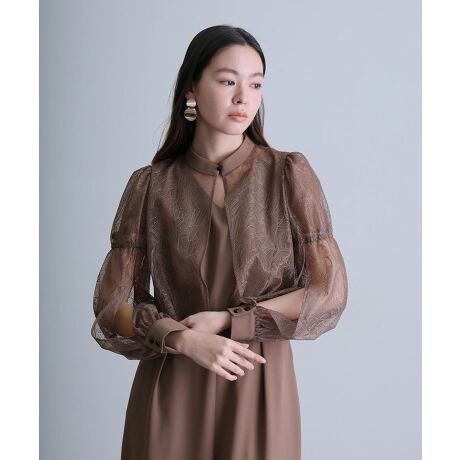 デコルテから肩まわりを包むシアーケープが、上品な抜け感を演出。