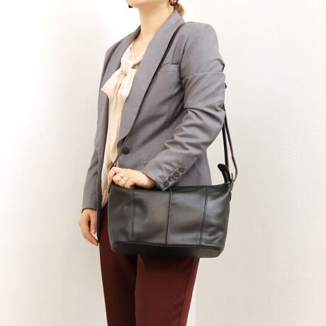 長財布、500mlボトルなどが入るサイズ感で本革なのに軽量なのがうれしいショルダーバッグです
