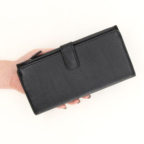 スナップボタン付きのベルトを開けるとカードポケットが見渡せる見開きデザイン