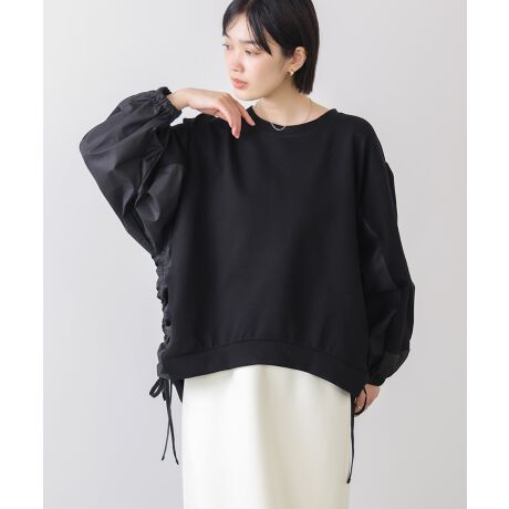 カジュアルな印象のスウェットに、布帛素材のボリューム袖を組み合わせることで、
