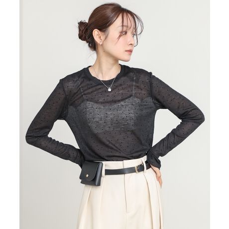 軽やかなシアー素材を使用。程よい透け感でレイヤードしやすく、柔らかな着心地が魅力です。シーズンを問わず、インナー次第で幅広いスタイリングを楽しめます。