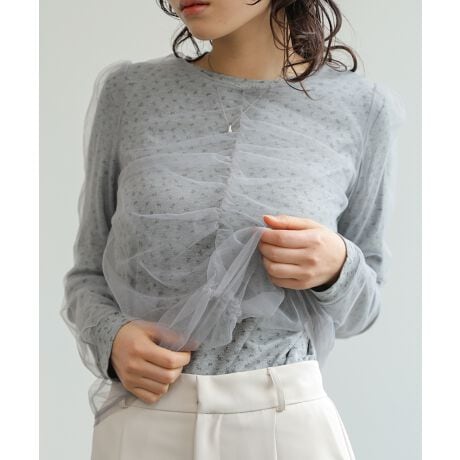 繊細なチュールをレイヤードした、今季注目のデザイントップス。カットソーの上にチュールを重ねたような仕様で、1枚で奥行きのあるスタイリングが完成します。ドット×チュールのフェミニンな印象に加え、小花柄チュールも展開し、どちらもトレンド感たっぷり。程よく身体に沿うシルエットで、インナー感覚でも主役トップスとしても活躍する一着です。