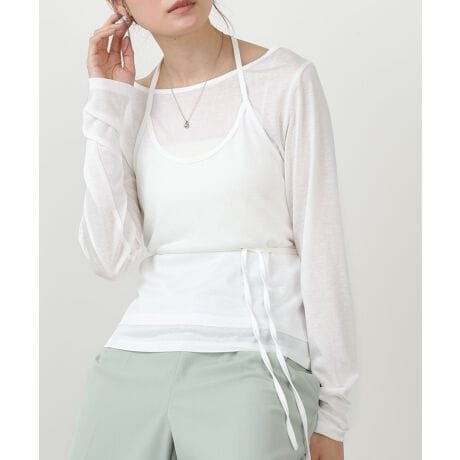 一枚で旬のレイヤードスタイルが完成する、ホルターレイヤードカットソー。ホルターネック風のデザインが、デコルテにさりげない抜け感をプラス。腰まわりには結び紐をあしらい、シルエットにメリハリをつけられるのもポイントです。シンプルながらも着こなしにニュアンスが生まれる、存在感のある一枚に仕上がりました。腰まわりの紐は2周巻きにすることで、自然にウエストマークできバランスよく着用可能です◎