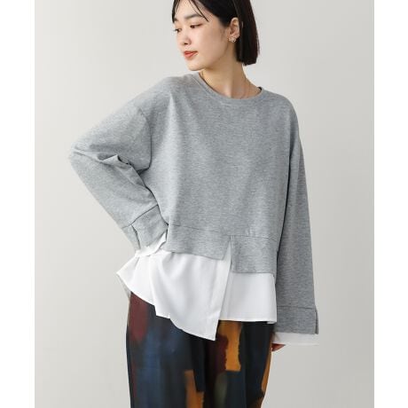 1枚でレイヤードスタイルが完成するプルオーバー。段差のついた裾や、スリットがアクセントとしてさりげなくおしゃれを演出します。ゆったりとしているので体型カバーにも◎