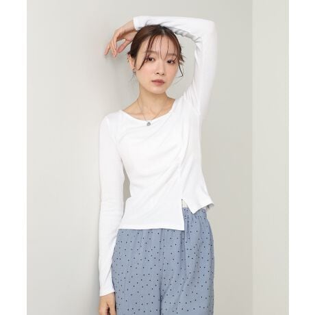 首元のニュアンスが目を惹く、変形ネックデザインのトップス。シンプルながらも、さりげなく個性を感じさせるネックラインで、1枚着るだけでこなれた印象に。身体のラインを拾いすぎないシルエットなので、デイリー使いしやすく、大人っぽく着こなせる万能アイテムです。