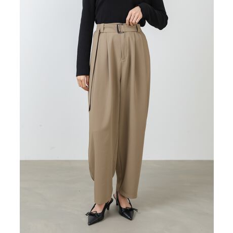 ツータック入りで立体感のあるシルエットが魅力の、ルーズスラックスパンツ。程よくワイドなラインに、共布ベルトをプラスすることで、こなれた大人カジュアルスタイルが完成します。腰まわりはすっきり見せつつ、リラックス感のある穿き心地で、デイリーに取り入れやすい一本です。
