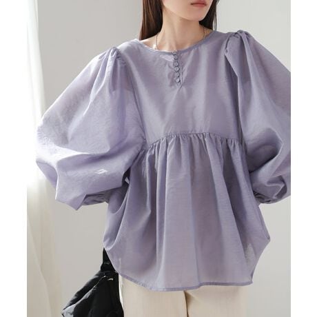 ボリューム感のあるブラウスなので、ボトムスはすっきり落ち感のあるシルエットがオススメです。スラックスでキレイめに、ジーンズでカジュアルにと様々なテイストのコーディネートに馴染みます。タイトスカート合わせでレディな着こなしも◎。タックアウトで着こなしてエアリー感のあるシルエットをお楽しみください。