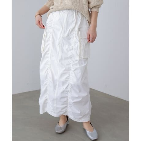 シャーリングがデザインが目を引くスカート。ワークポケットなどのミリタリーデザインがポイントに入っていながらも、シルエットやドレープ感で女性らしく仕上がるアイテムです。ハイゲージのニットやスウェットとの合わせでデザインを際立たせるスタイリングもおすすめですが、落ち着いたカラーリングでIラインのシルエットなので、デザインアイテムとも合わせやすく1枚あると重宝するスカートです。ウエストがリブなので楽ちんに着れるところも嬉しいポイントです。