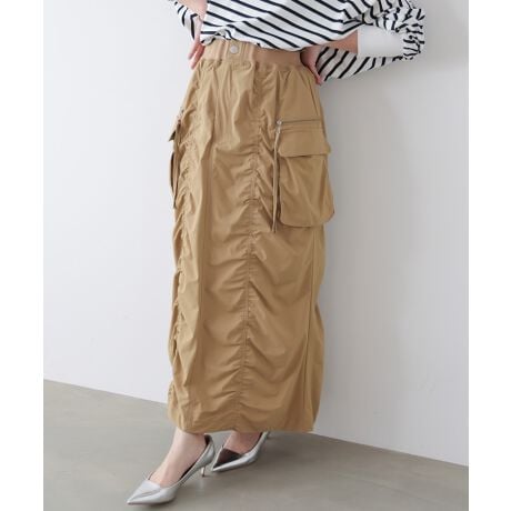 シャーリングがデザインが目を引くスカート。ワークポケットなどのミリタリーデザインがポイントに入っていながらも、シルエットやドレープ感で女性らしく仕上がるアイテムです。ハイゲージのニットやスウェットとの合わせでデザインを際立たせるスタイリングもおすすめですが、落ち着いたカラーリングでIラインのシルエットなので、デザインアイテムとも合わせやすく1枚あると重宝するスカートです。ウエストがリブなので楽ちんに着れるところも嬉しいポイントです。