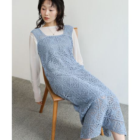 ワンピースが、全体がクロシェ編みのフラワーモチーフになっているのが魅力的なワンピース。スクエアネックでショルダーの幅が太く作られているので、顔周りや腕をスッキリと見せてくれます。両裾にスリットが入っているため、足首が見えたときに細く女性らしいシルエットを引き出してくれるワンピースになっています。