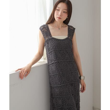 ワンピースが、全体がクロシェ編みのフラワーモチーフになっているのが魅力的なワンピース。スクエアネックでショルダーの幅が太く作られているので、顔周りや腕をスッキリと見せてくれます。両裾にスリットが入っているため、足首が見えたときに細く女性らしいシルエットを引き出してくれるワンピースになっています。