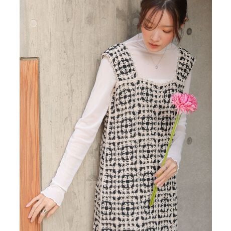 フラワーモチーフのクロシェ編みは、手触りが良く柔らかい素材を使っています。胸から膝下まで、柔らかい裏地が中についているため、敏感肌の方も一枚で着用していただけます。