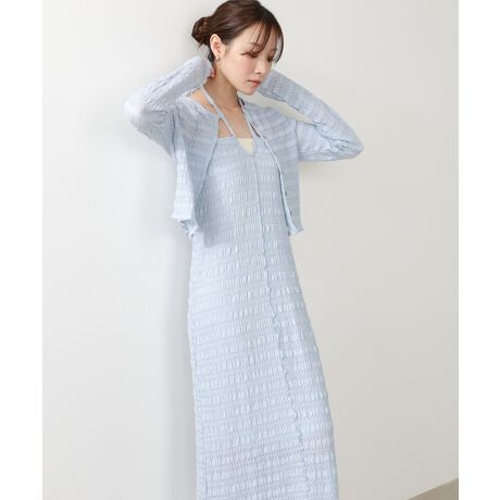 繊細なメローがアクセントになった、カーディガン+ワンピースのセットアイテム。縦感のある表面感とすっきりとしたIラインシルエットで、甘さがありながらも大人っぽく着こなせる一着です。ワンピースは首元の華奢なリボンがさりげないポイントに。カーディガンはメローデザインが柔らかいニュアンスを添え、羽織るだけでスタイリングが完成します。アイボリーはやさしく上品に、ブルーは透明感のある春らしい印象に、ブラックはシックで洗練された雰囲気に。セットではもちろん、それぞれ単品使いも楽しめる着回し力の高さも魅力です。