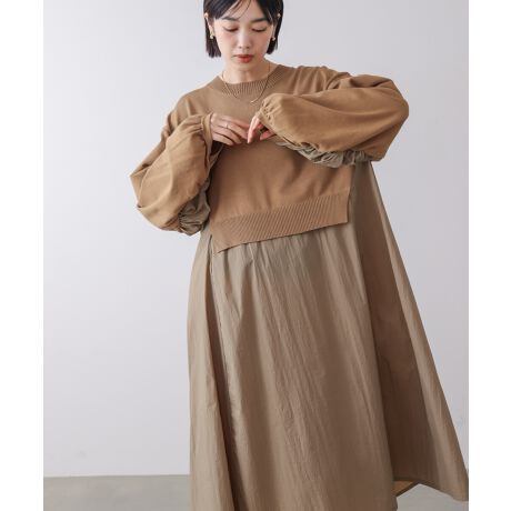 袖ギャザー布帛ドッキングニットワンピース