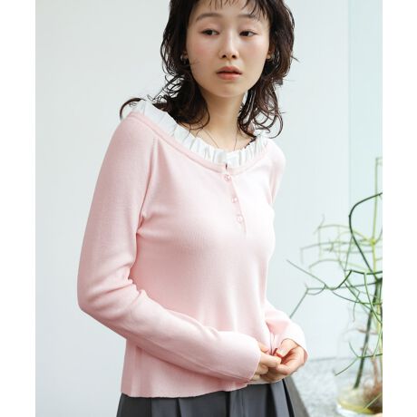 顔まわりをやさしく彩る衿フリルが印象的なニットトップス。デコルテをきれいに見せてくれるネックラインで、オフショルダーとしても着用できる2WAY仕様がポイントです。程よくフィットするシルエットで女性らしさを引き立てつつ、甘さはほんのり。ライトベージュは上品に、ピンクは春らしく柔らかく、ブラックはぐっと大人っぽく。カラーによって雰囲気を変えられる、着回し力の高い1枚です。