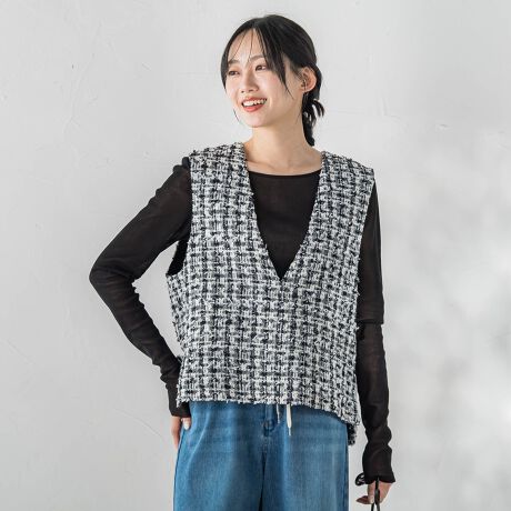 春らしいカラーや長めの羽モールのスラリット糸で顔周りも華やかになり、一枚で主役になるツィードベストになります。