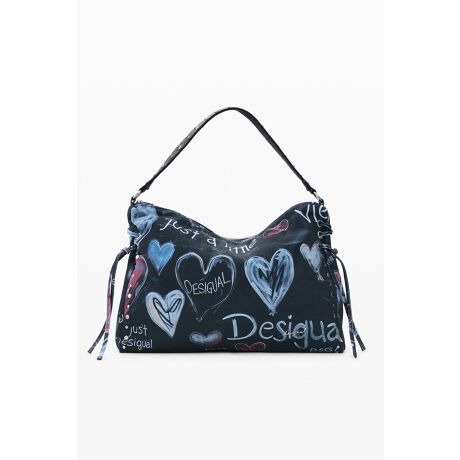 デニム風生地の大型ショルダーバッグ、グラフィティスタイルのプリント、交換可能なハンドル、側面の編み込みディテール付き。